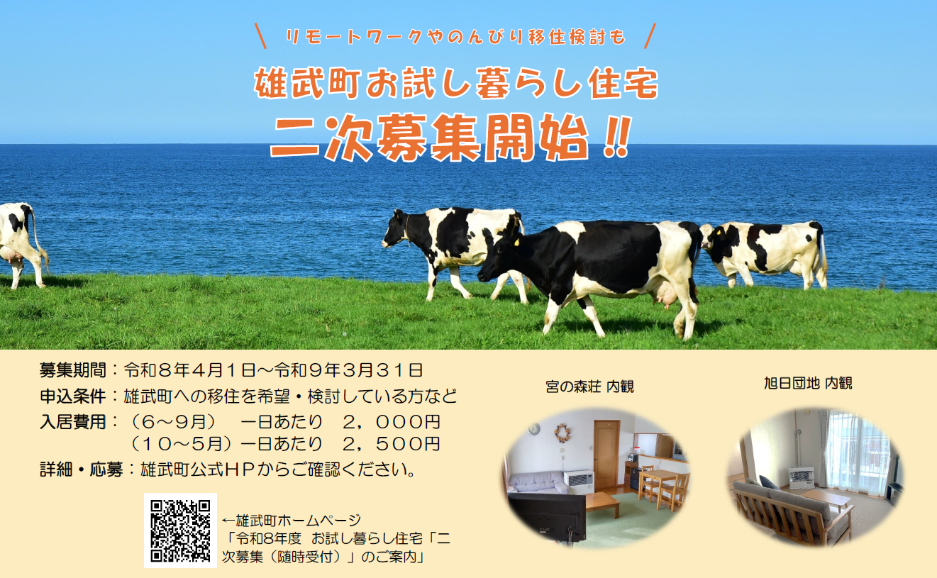 北海道移住・田舎暮らしを検討中の方必見!オホーツク最北端「雄武町(おうむちょう)」での生活を体験できる「雄武町お試し暮らし事業」につきまして、一次募集の結果、予約・利用の入っていない期間について二次募集の受付を行っています。